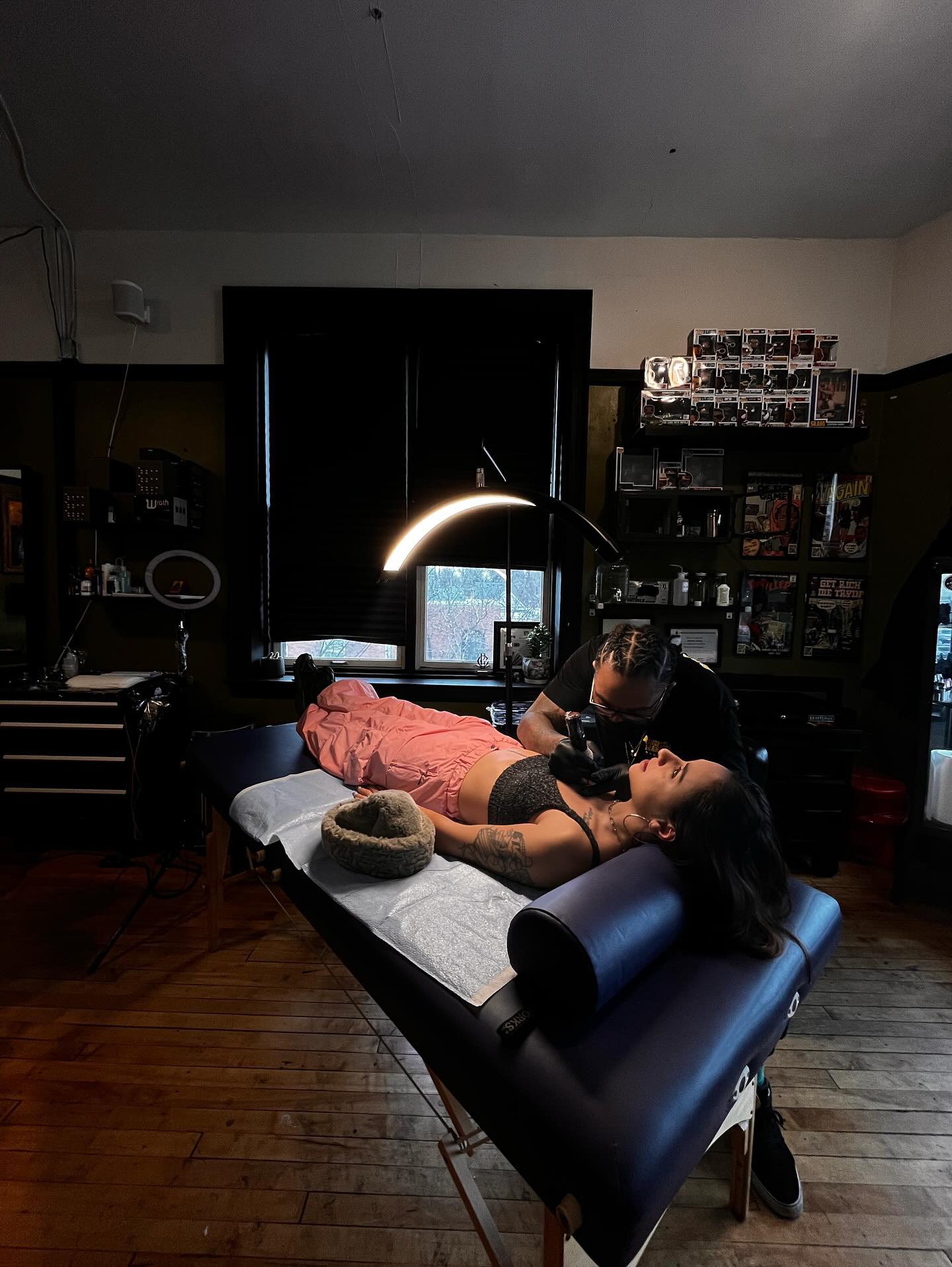 I’m a Westside Detroit native and lifelong artist, now tattooing at Detroit Grand Tattoo Co. in Ferndale, Michigan. My work blends pop culture, nostalgia, anime and Afro Americana themes — with a nod to traditional tattooing and the styles that shaped me. I also love working on blackwork, small lettering, and soft black and grey pieces.